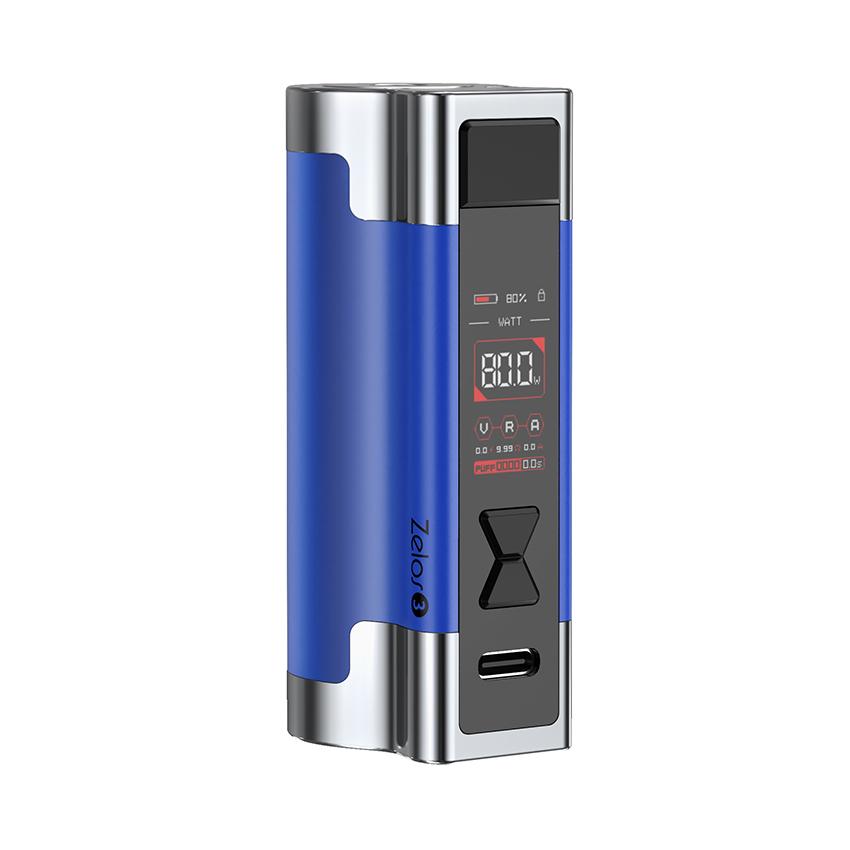 Aspire Zelos 3 Mod is constructed from sturdy but lightweight Aluminum alloy and zinc alloy through the oxidation process, the ergonomic design is easy to hold. Aspire Zelos 3 Mod features built-in 3200mAh battery with 80W max output. With a 0.96″” TFT color screen, you can adjust UI color and brightness. What’s more, Aspire self-developed smart ASP chipset system would ensure your safety and deliver better vaping experience with WATT/ VOLTAGE/ BYPASS/ TC/ TCR/ CPS mode..