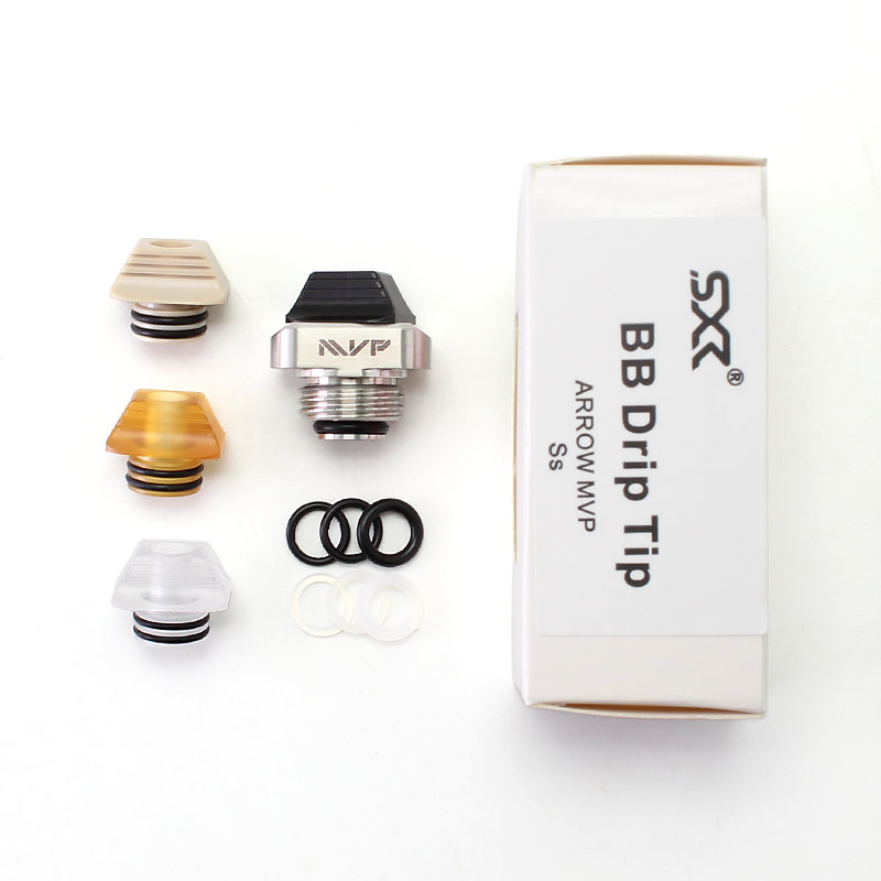 SXK Arrow MVP Drip Tip BB Billet Drip Tip kit composed of a stainless steel base in Billet Box format, a mouthpiece and a beauty ring. each pack has 4pcs(Black POM+White PET+PEEK+Ultem)